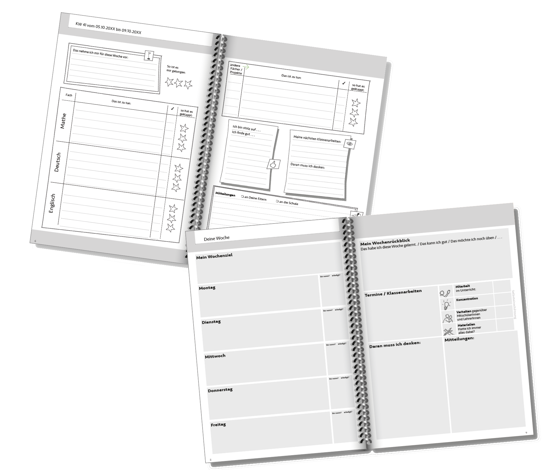 Im Mittelpunkt stehen die Wochenseiten mit der Hausaufgabenorganisation, welche selbstbestimmtes Lernen unterstützten.